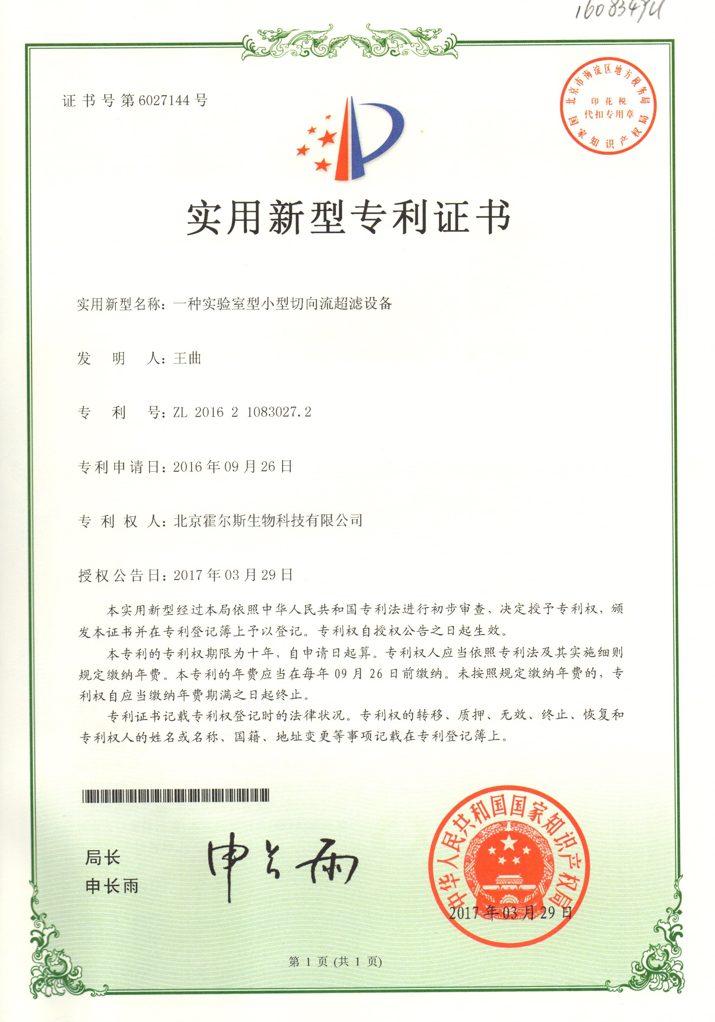 Holves obtains a patent for Tangential Flow Ultra filtration